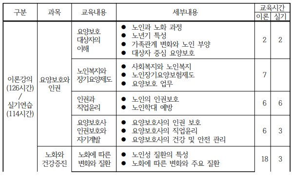 요양보호사 자격증 취득을 위해서는 이론, 실기, 실습을 포함한 총 240시간의 교육을 이수해야 합니다. 교육은 요양보호사 양성 전문학원을 통해 진행되며, 일반 신규자는 이론 126시간, 실기 114시간, 실습 80시간을 이수해야 합니다.