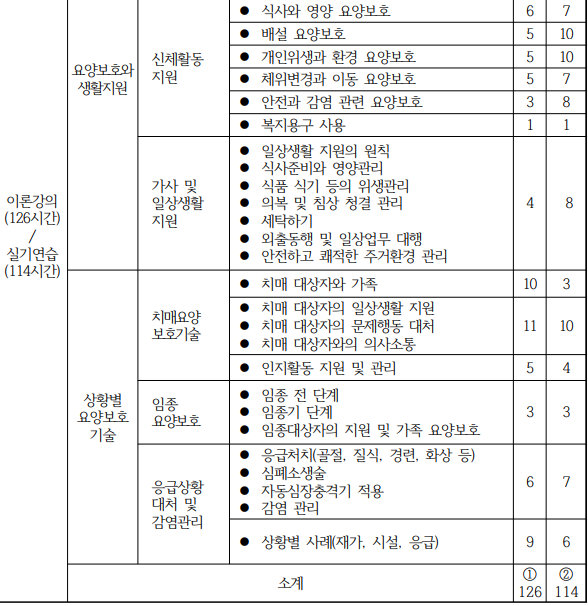 요양보호사 자격증 취득을 위해서는 이론, 실기, 실습을 포함한 총 240시간의 교육을 이수해야 합니다. 교육은 요양보호사 양성 전문학원을 통해 진행되며, 일반 신규자는 이론 126시간, 실기 114시간, 실습 80시간을 이수해야 합니다.