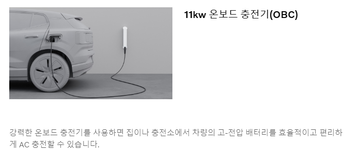 EX30은 272마력의 모터 출력과 5.3초의 제로백을 자랑하는 고성능 전기 SUV입니다. 1회 충전 주행거리는 351km(환경부 기준)이며, 최대 153kW의 급속 충전을 지원해 10~80%까지 약 28분 만에 충전이 가능합니다.