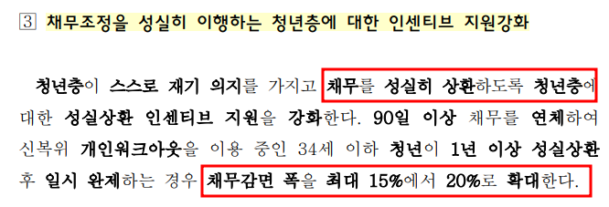 청년층 중에서 채무조정을 성실하게 이행하고 있는 경우에는 성실상환 인센티브를 추가로 지원해서 채무감면 폭을 최대 20%까지 확대할 예정입니다.
