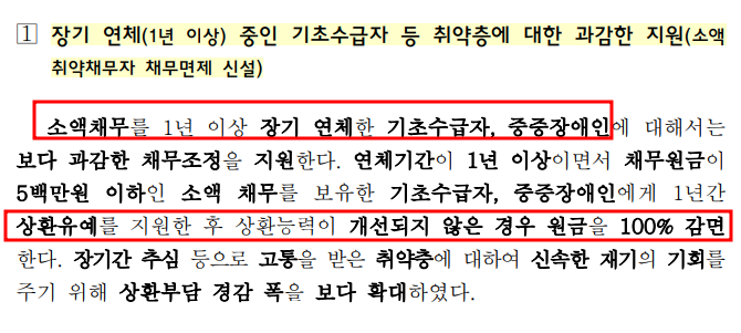 소액 채무를 1년 이상 장기 연체 중인 기초수급자와 중증장애인 등 취약층에 대해서는 1년간 상환유례를 지원하고 상환능력이 개선되지 않으면 100% 원금 감면을 지원합니다.