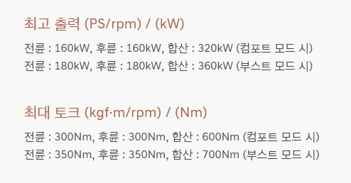 • 모터 출력: 듀얼 모터 시스템, 총 출력 435마력(320kW)