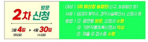 - 신규 신청자, 관외 경작자, 장기요양등급 판정자는 대면 신청 필수