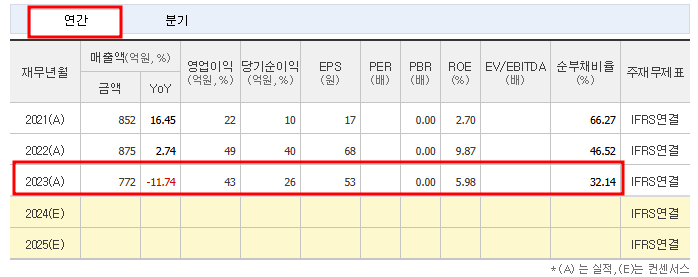 - 2024년(E): 매출액 772억 원, 영업이익 43억 원 (예상)