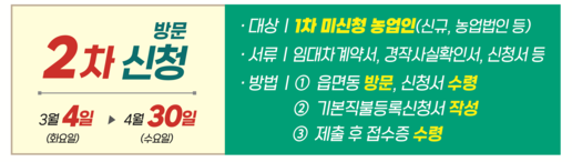 등록신청서와 관련 서류를 준비해야 합니다. 특히 소농직불금으로 신청 유형을 변경하고자 하는 농업인은 반드시 방문 신청을 해야 합니다.