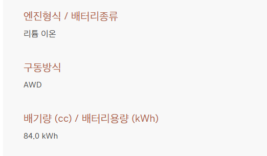 - 배터리: 84.0kWh 용량의 4세대 고전압 배터리